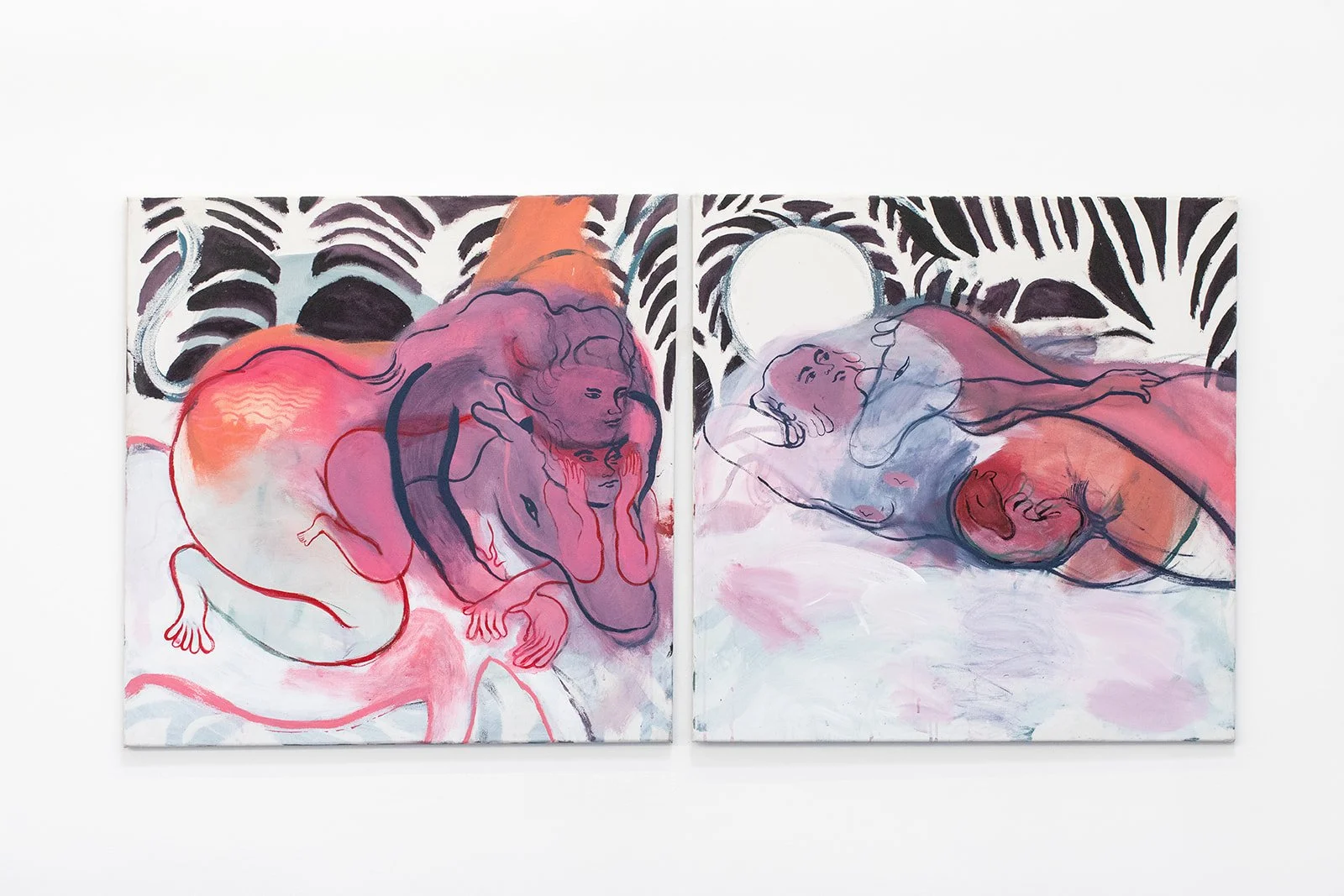 Charleston begins with drawing a self-portrait, and allows herself to be led by stories that emerge in her process of making. Describing this journey she says: "I begin with the self-portrait, then I derail it. This is what I am underneath. I am a river of this. All this mush and magic." Charleston draws inspiration from mythologies, folk tales, psychological narratives, dreams, memories, TV programs, and her life as a mother. Her muted paintings recall the immediacy and refinement of her ink drawings—deceptively simple, yet rich with recognizable forms that unfold into layered, intimate narratives. Figures embrace and entwine, bodies meld into one another or merge with animal counterparts, forming human-animal hybrids that lend the work a mythic, dreamlike quality. These compositions act as quiet stages for the theater of interior life, where characters seem absorbed in their own psychological worlds. Each painting offers a kind of window—into solitude, connection, and the tender, complicated rituals of care.